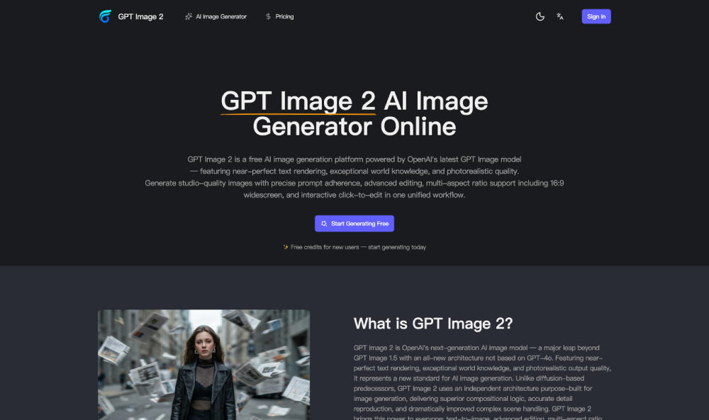 GPT Image 2 is a modern AI-powered image generation and editing platform designed to transform text prompts into high-quality visuals with minimal effort. Built around next-generation image modeling technology, GPT Image 2 enables users to create photorealistic images, detailed illustrations, and production-ready graphics directly in the browser. The platform combines text-to-image generation, image-to-image transformation, and advanced editing tools into a single streamlined workflow, making it accessible to both beginners and professionals. One of the standout strengths of GPT Image 2 is its ability to render text inside images with remarkable clarity. Unlike earlier AI image tools that often struggled with typography, GPT Image 2 produces accurate, readable text in posters, UI mockups, labels, and marketing assets. This capability makes it particularly valuable for commercial use cases where visual precision matters. GPT Image 2 also delivers strong photorealistic quality, supported by improved understanding of real-world objects, lighting, and composition. Its enhanced world knowledge allows the system to interpret prompts more accurately, reducing the need for repeated adjustments. Users can generate images in multiple aspect ratios such as widescreen, vertical, or square formats, making it suitable for social media, presentations, and advertising workflows. Beyond generation, GPT Image 2 offers intuitive editing features. Users can modify images using natural language instructions, adjust specific regions, upscale low-resolution assets, or transform existing visuals without complex tools. The platform is designed to keep the entire creative process within one interface, enabling fast iteration and efficient production. With a clean interface, optional free access, and scalable credit-based plans, GPT Image 2 lowers the barrier to professional-grade image creation. It serves as a practical solution for creators, marketers, and teams who need fast, reliable, and high-quality visual content without traditional design overhead.