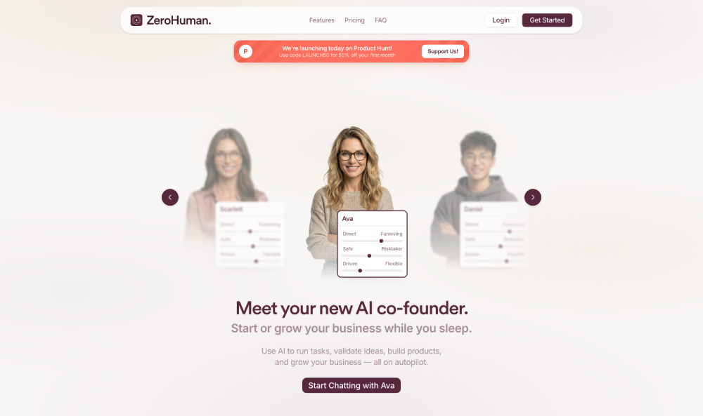 ZeroHuman serves as an innovative AI co-founder designed to help entrepreneurs launch and scale businesses effortlessly. It functions as a dedicated AI partner that operates around the clock, handling essential tasks while users rest. The platform enables users to brainstorm ideas, validate market demand, construct digital products, and drive organic growth through automated processes. By leveraging advanced AI agents, ZeroHuman manages daily projects such as creating and posting short-form videos across major social platforms like TikTok, Instagram, and YouTube. It conducts market testing via landing pages, surveys, and real interactions, then builds minimum viable products with minimal user input. Real-time dashboards track revenue progress, allowing quick iterations and scaling. Users review and approve tasks conveniently via mobile notifications, maintaining oversight without constant involvement. ZeroHuman emphasizes autonomy and simplicity, making it accessible even for those without technical expertise. Its open-source foundation ensures reliability and customization options, including personalized founder avatars, names, and personalities. Data ownership remains with users, supporting easy exports or self-hosting. Overall, ZeroHuman transforms traditional entrepreneurship by shifting heavy operational burdens to intelligent automation, fostering sustainable business development on autopilot.